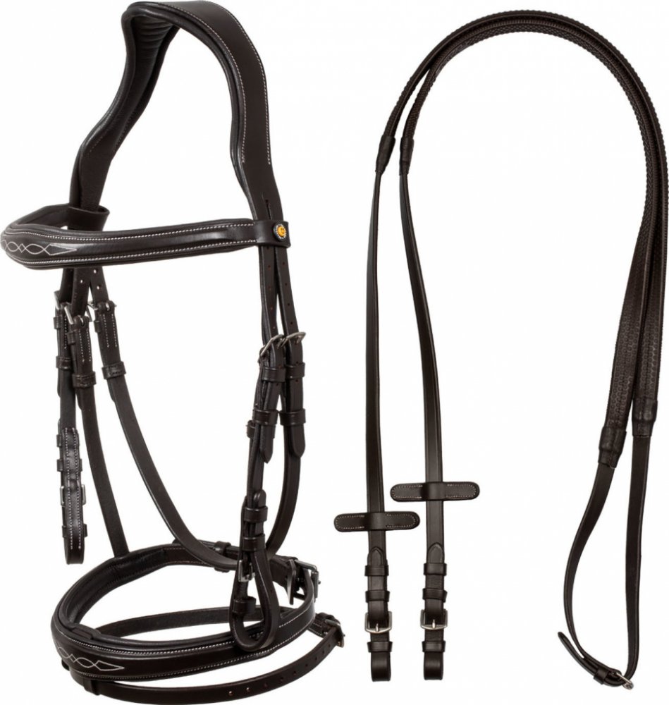 Vysoce kvalitní uzdečka vyrobená z jemné měkké kůže. Anatomický tvar uzdečky rovnoměrně rozkládá tlak na zátylek, čímž zajišťuje maximální pohodlí koně. Nátylník, čelenka a nánosník jsou polstrované. Vybavena přezkami z nerezové oceli. Zdobí ji vyšívané motivy na čelence a nánosníku. Dodávána s otěžemi. Dostupná také v černé barvě.