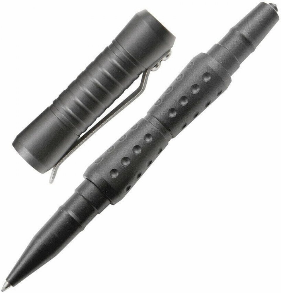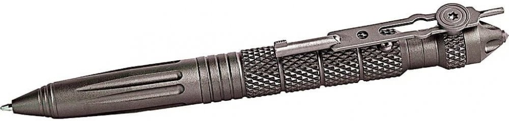 Lehké taktické pero opatřené wolframovým rozbíječem skla pro nouzové situace a externím klíčkem pro odemknutí pout. Tělo pera je vyrobené z lehkého leteckého hliníku v šedé barvě.