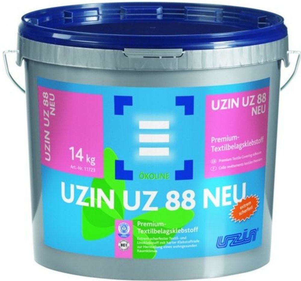 Uzin UZ 88 je disperzní lepidlo neobsahující pryskyřici pro spolehlivé lepení textilních podlahových krytin a linolea s extrémní pevností ve smyku s tvrdým hřebínkem. Lepidlo bezpečně a dlouhodobě zabraňuje smrštění ve spojích a tvoření spár i u rizikových krytin. Použití pouze v interiéru. Jako speciální lepidlo: pro všechny vpichované podlahové krytiny pro tkané textilní krytiny všeho druhu pro krytiny z přírodních vláken ze sisalu, kokosu a juty, vždy s provrstveným a latexovým rubem pro textilní krytiny ve zdravotnických zařízeních pro linoleum v pásech do 4mm na savé vystěrkované podklady na teplovodní podlahové vytápění pro namáhání kolečkovými židlemi podle DIN EN 12529 od 1mm tloušťky stěrkovací hmoty pro silné namáhání v obytných, komerčních a průmyslových prostorech vhodné pro mokré šamponování a čištění rozprašovacími extrakty podle RAL 991 A2 Vlastnosti: pachově neutrální během a po lepení extrémně pevný lepidlový hřeben minimalizuje smrštění ve spojích a zabraňuje zvednutým švům snížená spotřeba lepidla o cca 10% ve srovnání s pryskyřičnými lepidly spotřeba: 200 - 530 g/m² GISCODE D 1 - bez rozpouštědel EMICODE EC 1 PLUS - velmi malé emise RAL UZ 113 - šetrné k životnímu prostředí, protože má velmi malé emise