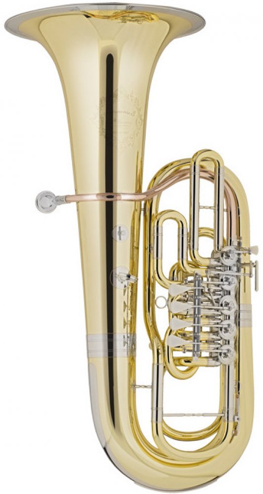 F tuba (HARMONIE 3), 5 ventilů [4+1], dvojí vrtání 18.2/19.2 mm, ozvučník 400mm s věncem, zlatomosazné eso, pakfongová pouzdra ventilů, trigger (rychlodolaďovač) na 5. tahu, minibal převod, kufr