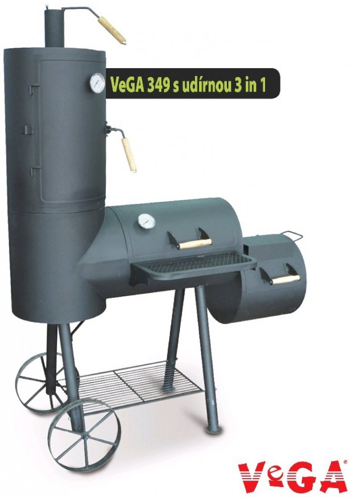 Všestranný velký komfortní Gril VeGA 349 s udírnou na dřevo, dřevěné uhlí a brikety slouží pro pohodlné grilování, pečení, vaření a uzení.
