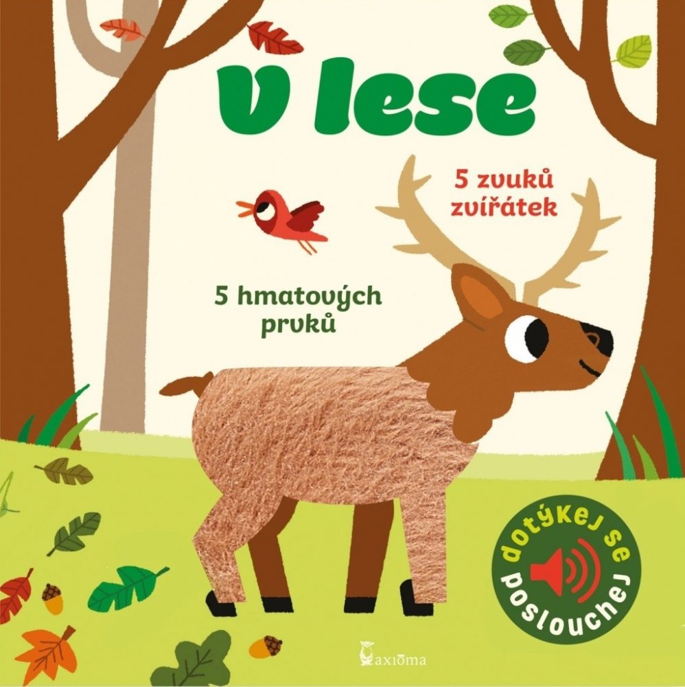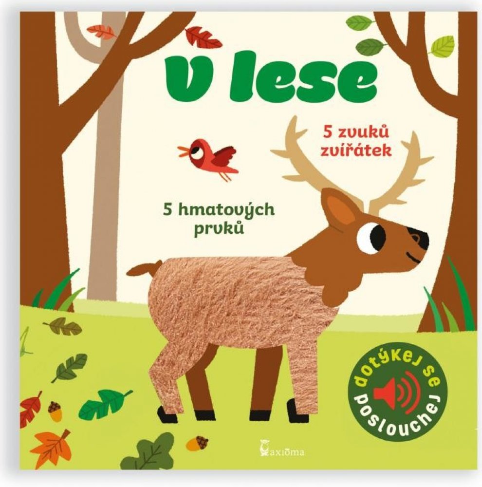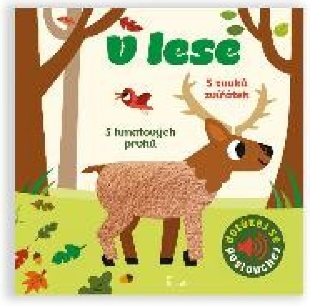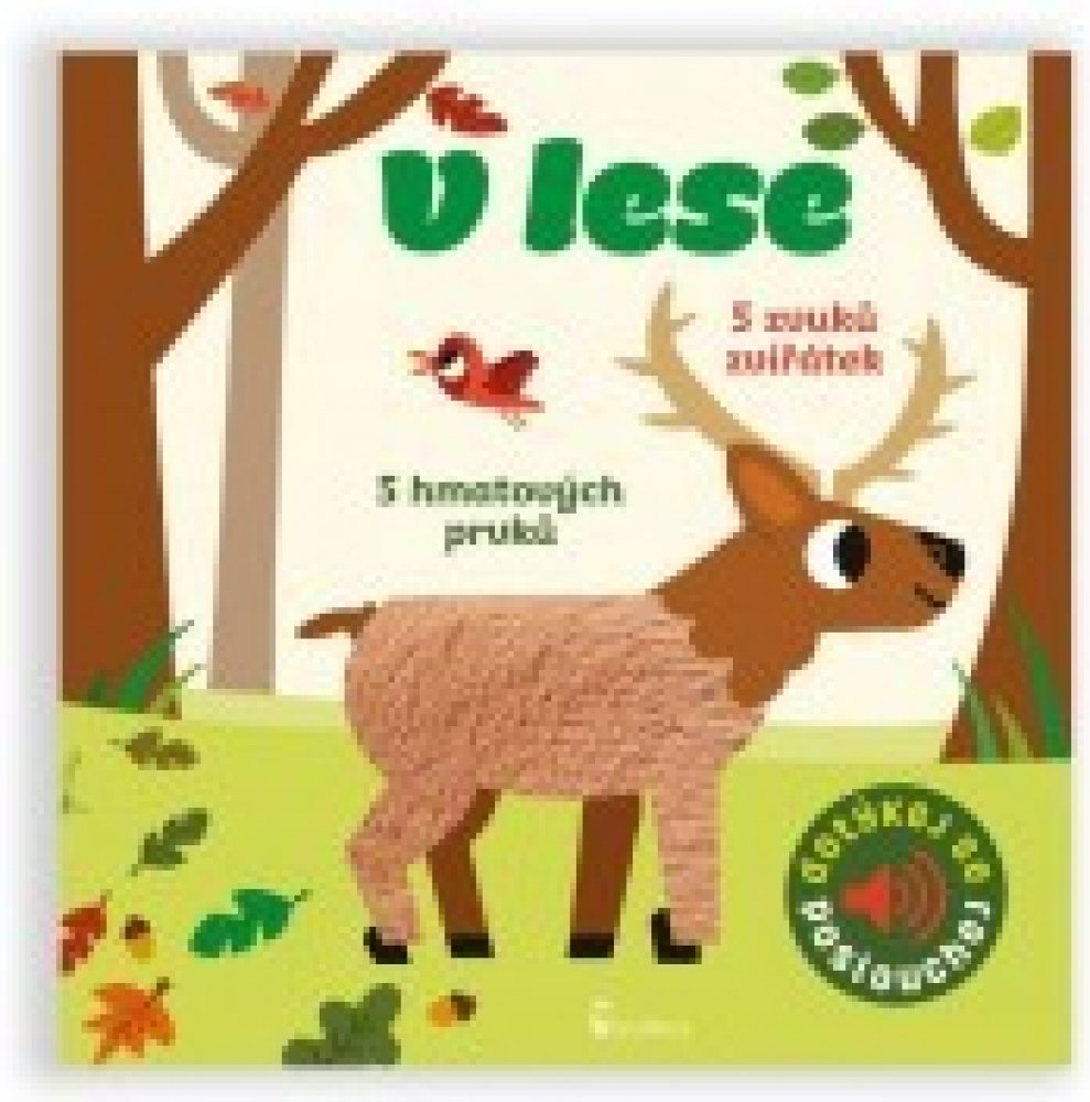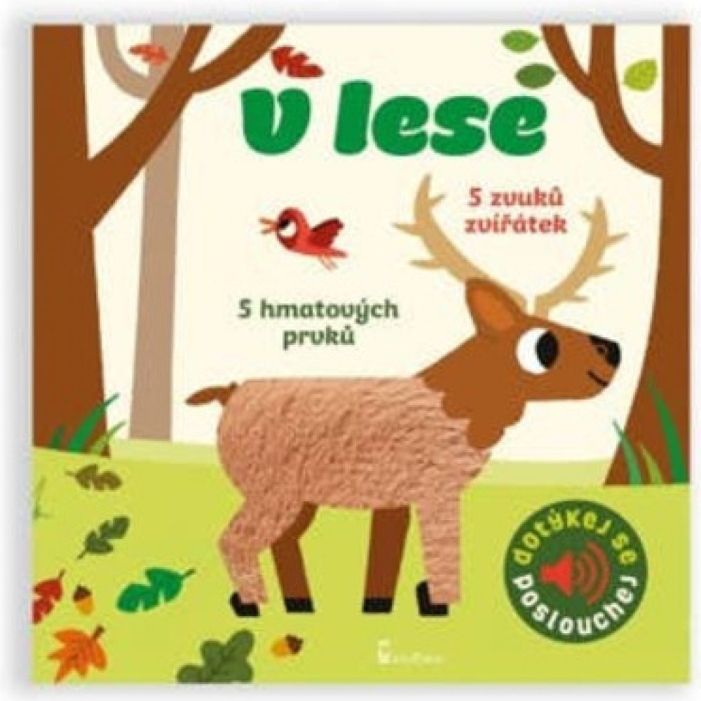 Veverku, žlunu, divoké prase, krtka a jelena. Na každé stránce jsou zakomponovány až dva různé, většinou textilní materiály, které jsou příjemné na dotek a na každé stránce je také nezbytné zvukové dotykové tlačítko, k jehož spuštění není zapotřebí síly. Reálné zvuky zvířat jsou ve vysoké kvalitě. Pro děti od 1 roku.