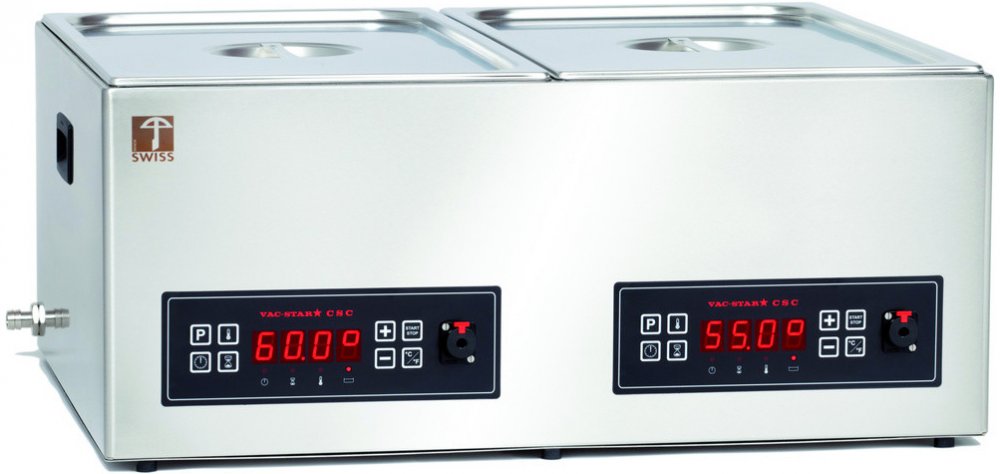Přístroje CSC dodáváme ve 2 modifi kacích. Základní varianta CSC umožňuje přípravu pokrmu za předem nastavené teploty. Tato teplota se udržuje s přesností ± 0,2 °C. Provedení CSC-CT obsahuje všechny funkce standardního CSC a navíc má teplotní sondu, se kterou se provádí úprava pokrmu podle tzv. teploty jádra, což má význam hlavně při úpravě velkých porcí masa. Dále má toto provedení možnost přednastavit a zapamatovat si až 10 způsobů přípravy potravin.Počet komor: 2Obsah varné lázně: 2x20 lSonda pro vnitřní teplotu: neOdtok (výpustní kohout): ano