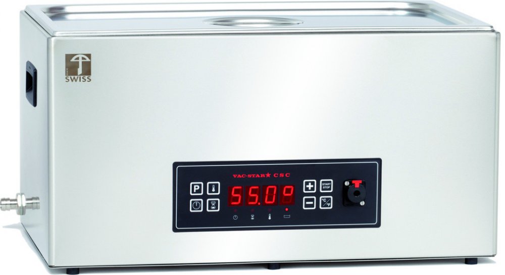 Přístroje CSC dodáváme ve 2 modifi kacích. Základní varianta CSC umožňuje přípravu pokrmu za předem nastavené teploty. Tato teplota se udržuje s přesností ± 0,2 °C. Provedení CSC-CT obsahuje všechny funkce standardního CSC a navíc má teplotní sondu, se kterou se provádí úprava pokrmu podle tzv. teploty jádra, což má význam hlavně při úpravě velkých porcí masa. Dále má toto provedení možnost přednastavit a zapamatovat si až 10 způsobů přípravy potravin.Počet komor: 1Obsah varné lázně: 20 lSonda pro vnitřní teplotu: anoOdtok (výpustní kohout): ano