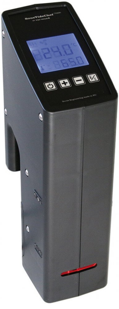 Cirkulační hlavici Sous-Vide Chef CLASSIC firmy VACSTAR doporučujeme do restaurací i na hobby domácí vaření. Vejde se do každé kuchyně a příprava s ní je jednoduchá a přesná. Velký přehledný displej vám nabídne teplotu v rozmezí 25-99 °C a ohřev vody po dobu až 99 hodin. Je tak ideální pro vaření metodou Sous-Vide. Pro přípravu jídel s touto hlavicí potřebujete pouze velký hrnec, gastro nádobu nebo jakoukoliv jinou nádobu do 40 litrů. Nastavíte jednoduše čas a teplotu a přístroj začne pracovat. Až dosáhne teploty, oznámí vám to signálem. Pak už můžete vložit balíčky se zavakuovanými potravinami a nechat jej pracovat. Nemusíte se bát odpaření vody, přístroj si sám hlídá její hladinu. Před odpařením navíc chrání vodu izolační kuličky. Dokonalost hlavice tkví i v preciznosti. Hlavice má přesnost ohřevu vody na 0,2 °C. Další výhodou je bezúdržbovost a robustnost, daná poctivou výrobou. Vybavení Vac-Star je prověřené v kuchyních profesionálů i v domácnostech nadšených kulinářských fanoušků. Můžeme s klidným svědomím slíbit, že s vybavením Vac-Star, vyráběným v České republice, nesáhnete vedle. Rozměry (š x h x v) 90x165x350 mm Hmotnost 2,1 kg Napětí 230 V Maximální objem 40 l Příkon 1000 W hmotnost pouze 2,1 kg díky spodní cirkulaci může být nádoba menší než 40 l nezabere mnoho místa (rozměry 350 × 90 × 165 mm) teplota nastavitelná v rozmezí 25-99 °C přesnost 0,2 °C, možnost nastavení ve °F při poklesu hladiny vody upozorní alarmem pojistka proti přetížení mobilní aplikace Vám pomůže s recepty na přípravu pokrmů dostupnost náhradních dílů – zaručená po 10 let