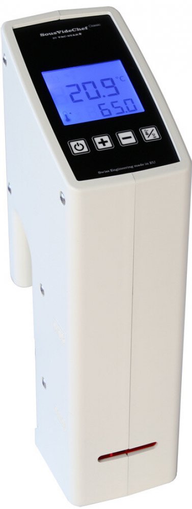 Cirkulační hlavici Sous-Vide Chef CLASSIC doporučujeme do restaurací i na hobby domácí vaření. Vejde se do každé kuchyně a příprava s ní je jednoduchá a přesná. Velký přehledný displej vám nabídne teplotu v rozmezí 25-99 °C a ohřev vody po dobu až 99 hodin. Je tak ideální pro vaření metodou Sous-Vide. Pro přípravu jídel s touto hlavicí potřebujete pouze velký hrnec, gastro nádobu nebo jakoukoliv jinou nádobu do 40 litrů. Nastavíte jednoduše čas a teplotu a přístroj začne pracovat. Až dosáhne teploty, oznámí vám to signálem. Pak už můžete vložit balíčky se zavakuovanými potravinami a nechat jej pracovat. Nemusíte se bát odpaření vody, přístroj si sám hlídá její hladinu. Před odpařením navíc chrání vodu izolační kuličky. Dokonalost hlavice tkví i v preciznosti. Hlavice má přesnost ohřevu vody na 0,2 °C. Další výhodou je bezúdržbovost a robustnost, daná poctivou výrobou. Vybavení Vac-Star je prověřené v kuchyních profesionálů i v domácnostech nadšených kulinářských fanoušků. Můžeme s klidným svědomím slíbit, že s vybavením Vac-Star, vyráběným v České republice, nesáhnete vedle. Rozměry (š x h x v) 90x165x350 mm Hmotnost 2,1 kg Napětí 230 V Maximální objem 40 l Příkon 1000 W hmotnost pouze 2,1 kg díky spodní cirkulaci může být nádoba menší než 40 l nezabere mnoho místa (rozměry 350 × 90 × 165 mm) teplota nastavitelná v rozmezí 25-99 °C přesnost 0,2 °C, možnost nastavení ve °F při poklesu hladiny vody upozorní alarmem pojistka proti přetížení mobilní aplikace Vám pomůže s recepty na přípravu pokrmů dostupnost náhradních dílů – zaručená po 10 let