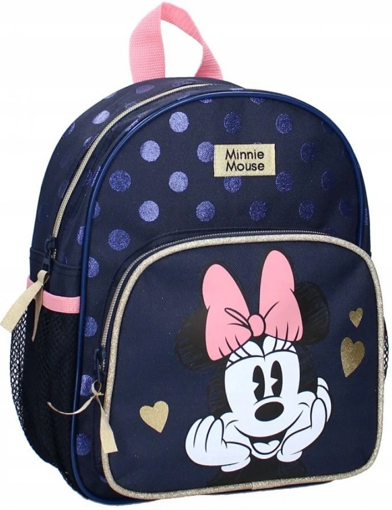 Elegantní dívčí batůžek Minnie Mouse - Disney - motiv Glitter Love. Batoh má jeden hlavní oddíl a menší přední kapsu, oboje se zapínáním na zip. Přední část zdobí obrázek myšky Minnie s její charakteristickou mašlí a zlatě třpytivé okrasné lemy. Popruhy na záda jsou dostatečně široké aby netlačily a jejich délka je nastavitelná. Nechybí ani ouško na zavěšení a boční pružné síťky na nápoj, nebo jin...
