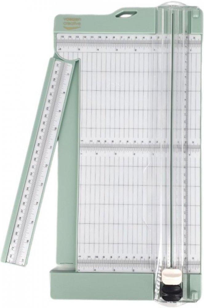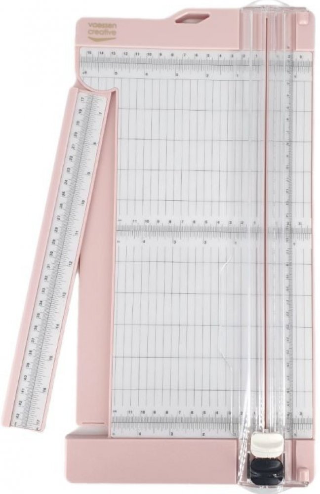 Páková řezačka papíru Vaessen creative umožňuje řezání papíru A4 na výšku nebo A3 naležato. Délka řezu 30,4cm. S tímto gilotinovým řezacím nástrojem od Vaessen Creative můžete bez námahy proříznout papír a lepenku, stejně jako tenkou pěnu, korek, plsť, kůži, látku a vinyl. Rozměry jsou uvedeny v palcích i centimetrech. Na první pohled vidíte také velikost A4, A5 a A6. Celková šířka pracovní plochy řezačky je 30,4cm. Možnost řezu až 12 papírů najednou (80g/m2). Samoostřící čepel. Široký plastový kryt umožňuje přidržet papír ve správné poloze. Varování: Nevhodné pro děti do 3 let. Obsahuje malé časti a ostré hrany. Nebezpečí udušení a úrazu.
