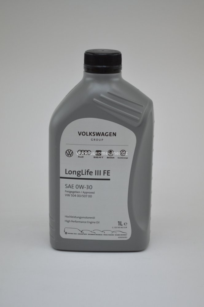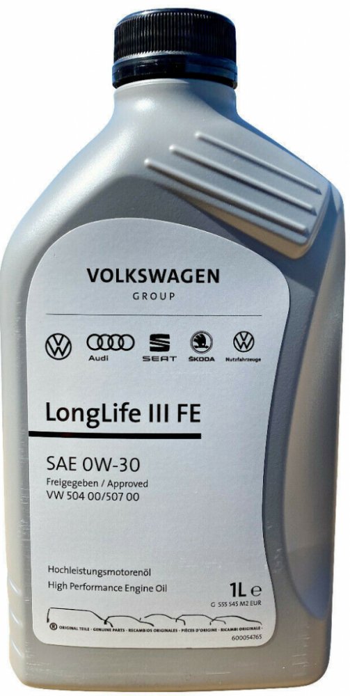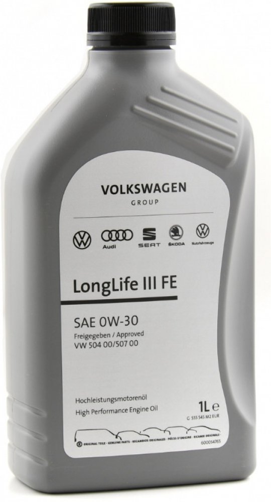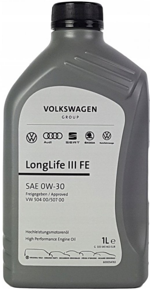 Originální syntetický motorový olej VOLKSWAGEN VAG GS55545M2 0W-30 LONGLIFE III pro vozidla koncernu Volkswagen group - VW, Škoda, Seat, Audi splňující specifikace VW 504.00 a 507.00, lze jej použít pro všechny benzinové a dieselové motory. roky).