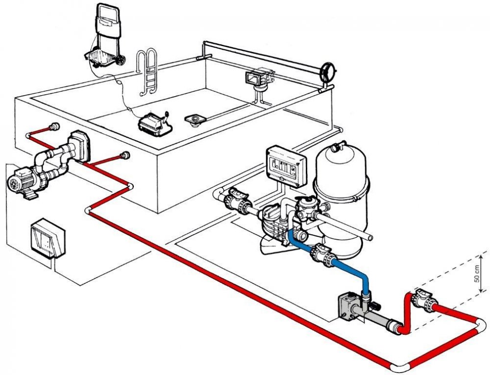 Topné těleso je spínáno stykačem, který je ovládán výše uvedeným termostatem, bezpečnostním indikátorem průtoku. Z tohoto důvodu je k topení nutná tzv. velká automatika - 24 hodinový programátor filtrace, proudový chránič (ochrana před nebezpečným dotykovým napětím), tepelná ochrana motoru, stykač a spínač topení.