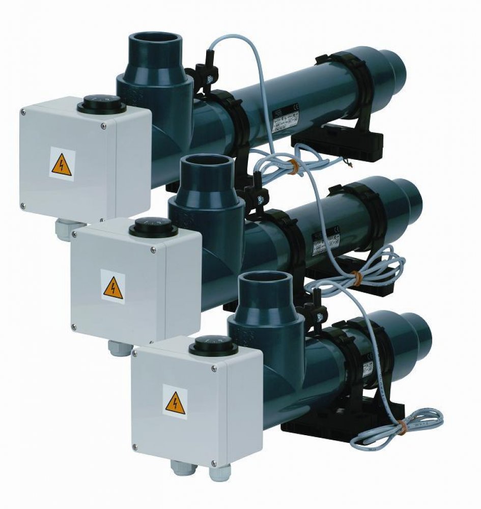 Elektrické průtokové ohřívače jsou určeny k ohřevu vody v bazénech a vířivých vanách, činnost spočívá v ohřevu protékající vody tělesem topení, teplota ohřívané vody je nastavena regulačním termostatem. Topné těleso je spínáno stykačem, který je ovládán výše uvedeným termostatem, bezpečnostním indikátorem průtoku. Z tohoto důvodu je k topení nutná tzv. velká automatika - 24 hodinový programátor filtrace, proudový chránič (ochrana před nebezpečným dotykovým napětím), tepelná ochrana motoru, stykač a spínač topení.