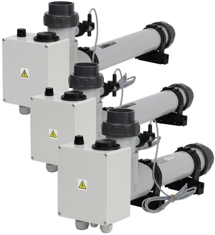 Elektrické průtokové ohřívače jsou určeny k ohřevu vody v bazénech a vířivých vanách, činnost spočívá v ohřevu protékající vody tělesem topení, teplota ohřívané vody je nastavena regulačním termostatem. Topné těleso je spínáno stykačem, který je ovládán výše uvedeným termostatem, bezpečnostním indikátorem průtoku. Z tohoto důvodu je k topení nutná tzv. velká automatika - 24 hodinový programátor filtrace, proudový chránič (ochrana před nebezpečným dotykovým napětím), tepelná ochrana motoru, stykač a spínač topení.