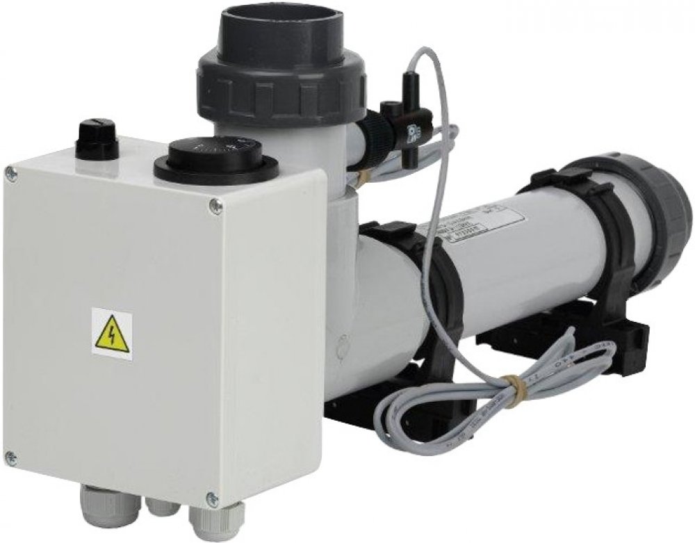 Topné těleso je spínáno stykačem, který je ovládán výše uvedeným termostatem, bezpečnostním indikátorem průtoku. Z tohoto důvodu je k topení nutná tzv. velká automatika - 24 hodinový programátor filtrace, proudový chránič (ochrana před nebezpečným dotykovým napětím), tepelná ochrana motoru, stykač a spínač topení.