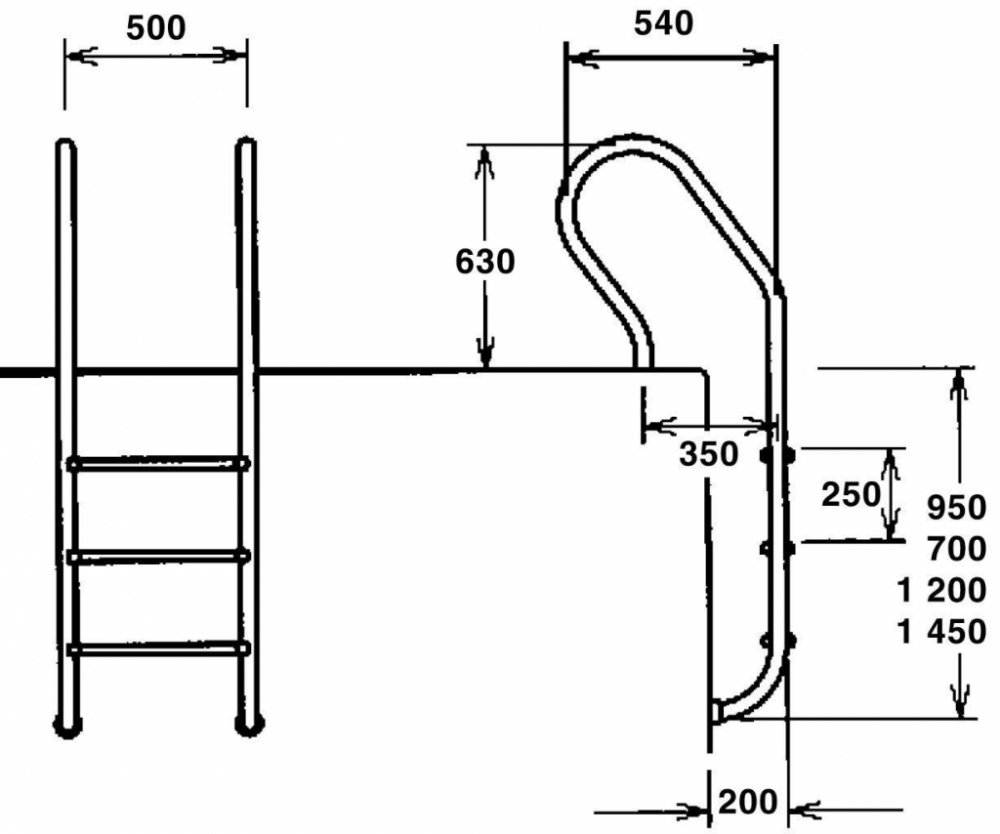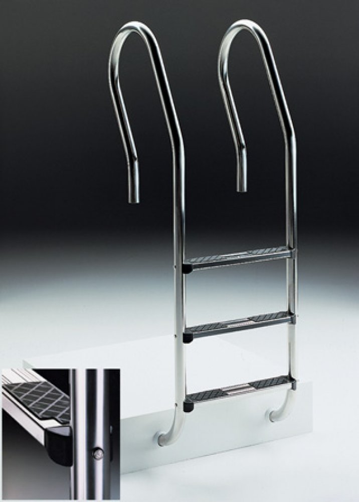 Žebříky jsou určeny pro privátní a komerční bazény. Jsou vyrobeny z leštěné nerez oceli. AISI 316 průměru 43 mm. Stupně jsou doplněny protiskluz. nášlapy. Kotvení se dodává s pouzdrem a svorkou pro uzemnění.