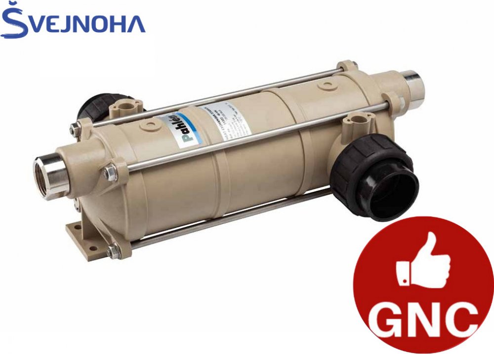 • Kvalitní švédská výroba • Spirálovitý typ tepelného výměníku • Spirála: titanová, odolná mořské, slané a silně znečištěné vodě • Vnější plášť vyroben z odolného termoplastu s vysokým obsahem skelných vláken • Šroubení • Konektory 50 mm pro napojení jsou součástí balení • Dva modely: 40 a 75 kW, vhodné pro bazény až do 300 m3 • Vhodné pro vytápění veřejných i residenčních bazénů, vířivek atd. • Maximální pracovní tlak topné vody: 5 bar • Maximální pracovní tlak ohřívané vody: 4 bar • Lze připojit k různým druhům boilerů, tepelným čerpadlům nebo solárním kolektorům • Čistá/přepravní hmotnost kg: 14 kg • Výkon: 40 kW • Max. pracovní tlak: 5 bar • Hmotnost: 2.5 kg