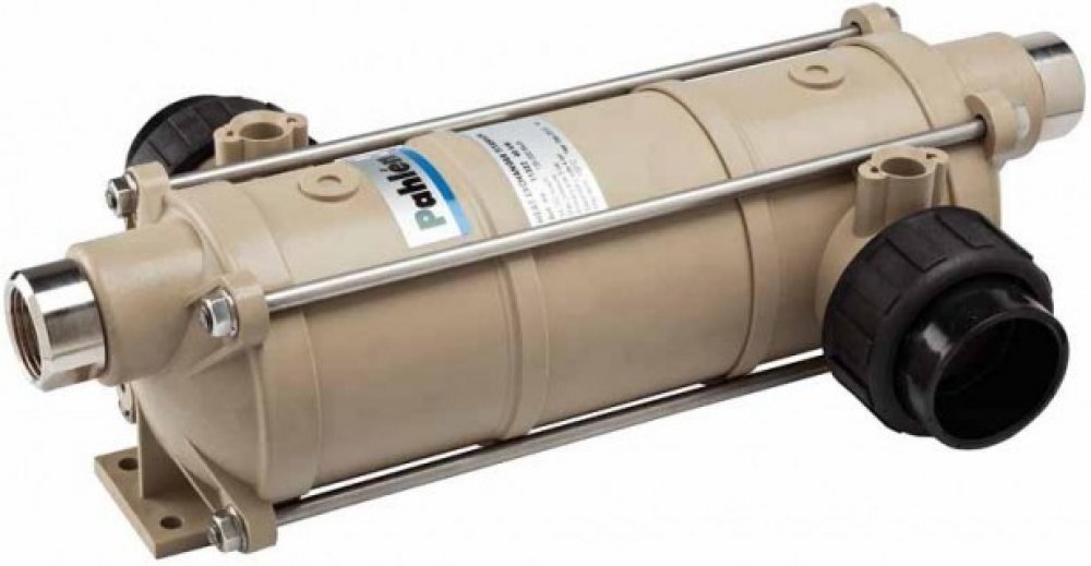 Bazénový tepelný výměník Hi-Temp - TITAN s výkonem 40 KW je určený pro ohřev bazénové vody o objemu 25 - 40 m3.Bazénový výměník HI-TEMP slouží pro ohřev interiérových i venkovních bazénů a vířivých van. Disponuje TITANOVOU spirálou, proto je vhodný pro SLANOU úpravu vody.