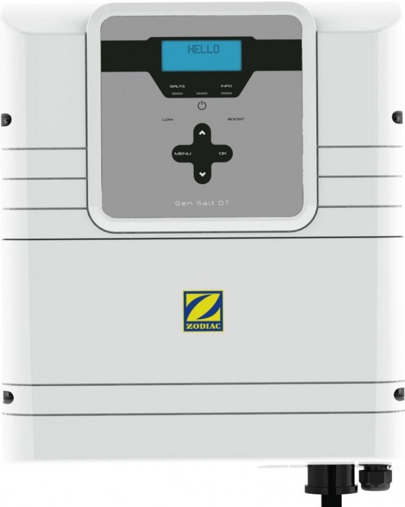 Zodiac® GENSALT OT má krytí IP43 a maximální produkcí chlóru 10g/h pro privátní bazény do 40 m3.Úprava slané vody - ZODIAC GENSALT OT 10, do 40 m3
