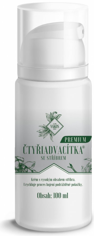 PREMIUM ČTYŘIADVACÍTKA SE STŘÍBREM 100 ml je krém s vysokým obsahem koloidního stříbra. Napomáhá potlačovat nežádoucí bakterie problematické pokožky (akné, vyrážka, jinak poškozená pleť) a urychlovat proces hojení.