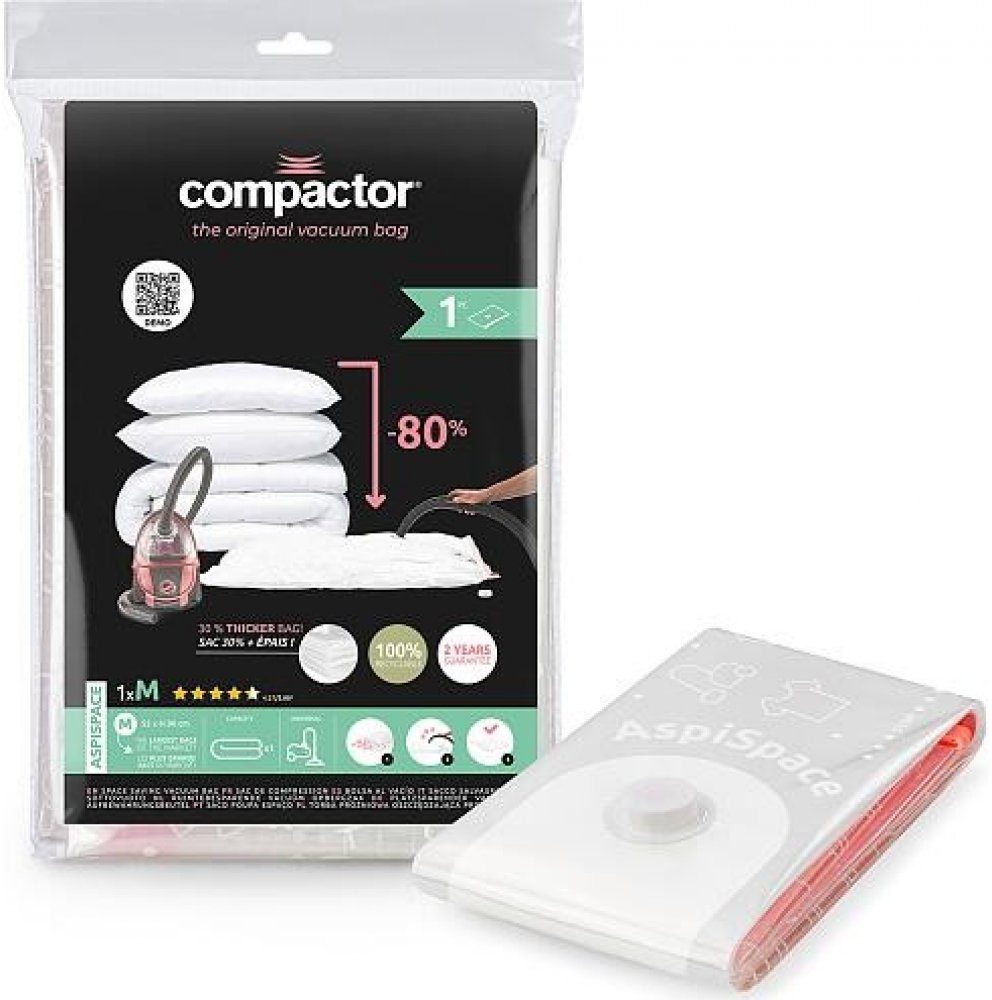 Dejte sbohem přeplněným skříním Objevte efektivní způsob skladování s vakuovými úložnými pytli Compactor Aspispace. Tyto prémiové pytle vám pomohou ušetřit až 80 % úložného prostoru a zároveň dokonale ochrání uložený textil před vnějšími škodlivými vlivy. Úsporu místa získáte nejen ve skříních, ale také třeba v cestovním kufru. V praxi to znamená, že např. peřina o tloušťce 50 cm se po odsátí vzdu...