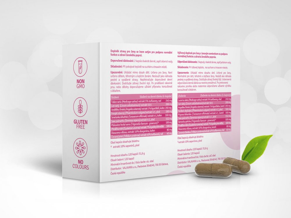 Doplněk stravy vyvinut speciálně pro ženy, které chtějí pečovat o své poprsí, pokožku, vlasy nehty a sexuální zdraví. Silné složení - v jedné denní dávce 1440mg směsi. Přírodní produkt – základ produktu je tvořen čistě přírodními bylinnými extrakty.