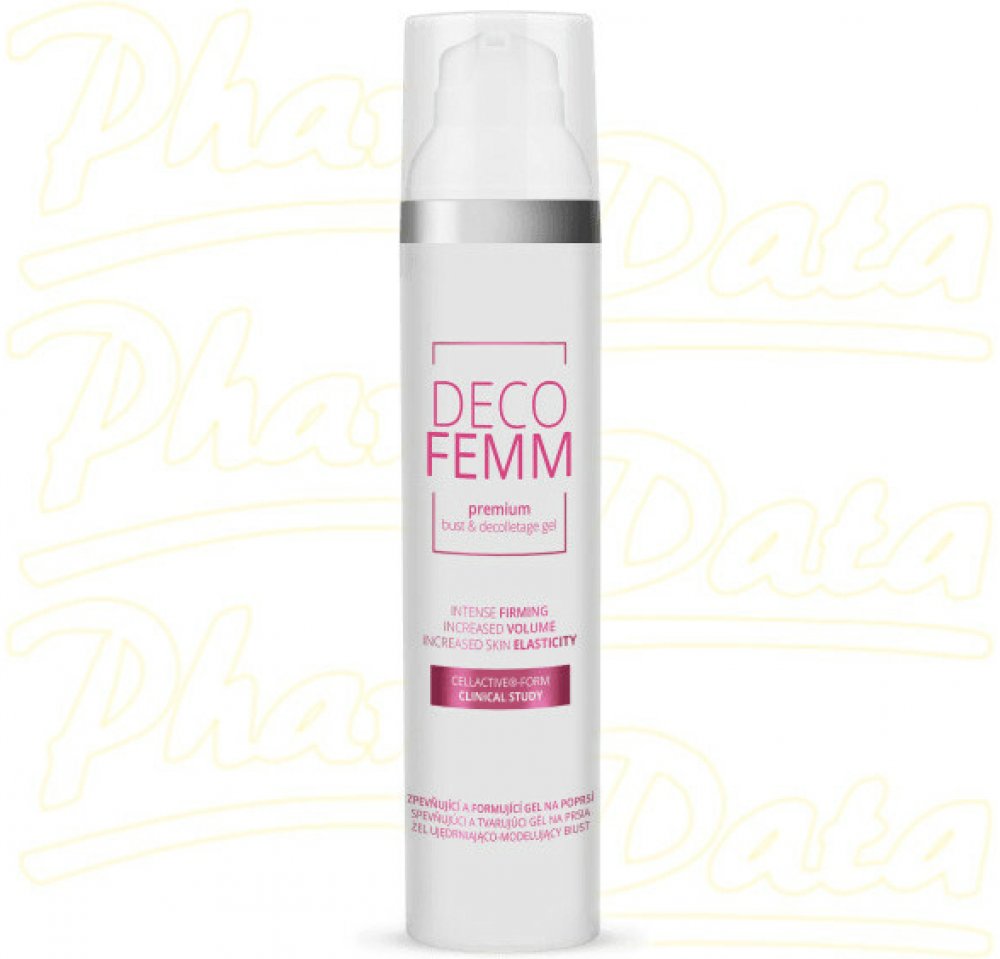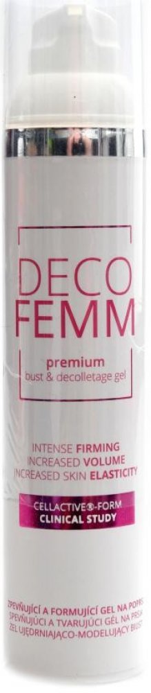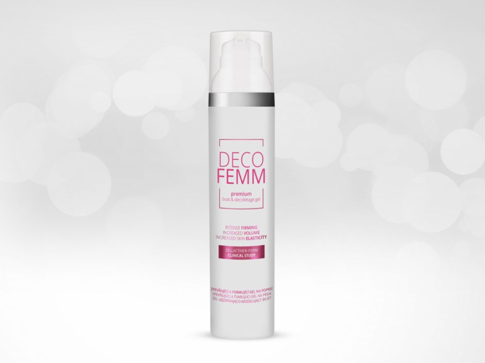 DecoFemm Premium Bust & Decolletage Gel je inovativní produkt, který nabízí bezpečnou alternativu k chirurgickým zákrokům a hormonálním pilulkám. Obsahuje čtyři patentované komplexy látek, jejichž základ tvoří jak přírodní, tak látky biotechnologického původu, které působí na zpevnění poprsí a zlepšení elasticity kůže v oblasti dekoltu.
