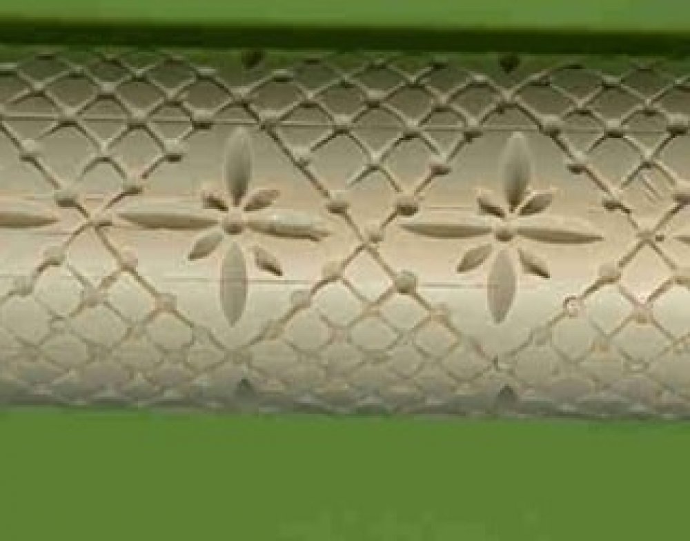 Váleček z umělé pryskyřice s motivem křížového květu v prostém poli s kombinací mřížkového pole.