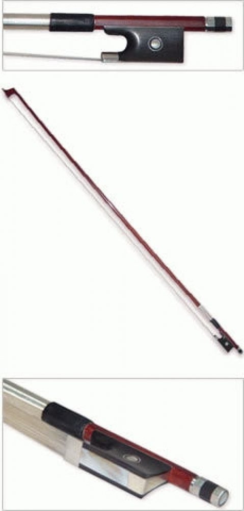 Osmihranný smyčec pro housle velikosti 1/2 se stříbrného vinutím a žabkou s perleťovou tečkou, vyrobený z brazilwood.