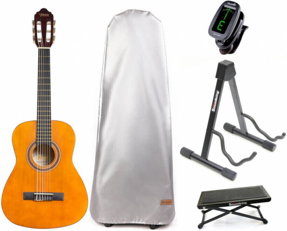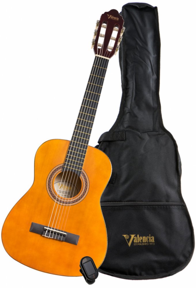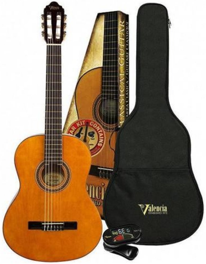 Valencia VC102K - set obsahující klasickou kytaru velikosti 1/2, klipovou ladičku a nylonové pouzdro.Vrchní deska nástroje, boky i záda jsou vyrobeny z lípy. Javorový krk s menzurou 560mm, je osazen ebonizovaným hmatníkem s 19 mosaznými pražci. O ladění a intonaci se stará ebonizovaná kobylka s plastovým struníkem, plastový nultý pražec a standardní poniklovaná mechanika. Tělo i krk nástroje jsou potaženy černým lemováním a vyhotovené v lesklém laku.