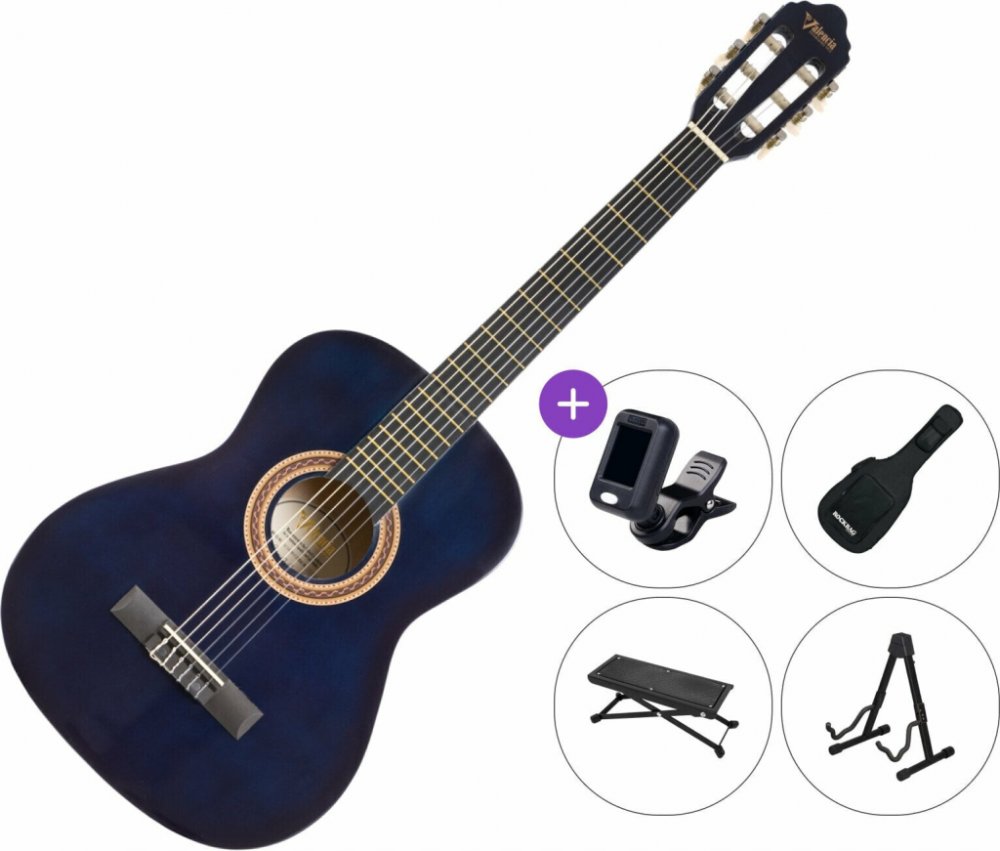 Klasická kytara velikosti 3/4 určená především pro začátečníky a děti do 12 let. Vrchní deska nástroje je vyrobena z lípy, luby a zadní deska ze stejné dřeviny jako rezonanční deska. Javorový krk s menzurou 610mm, je osazen ebonizovaným hmatníkem s 19 mosaznými pražci. O ladění a intonaci se stará ebonizovaná kobylka s plastovým struníkem, plastový nultý pražec a standardní poniklovaná mechanika. Tělo i krk nástroje jsou potaženy černým lemováním a vyhotovené v lesklém laku. Barevné provedení: Blue Sunburst