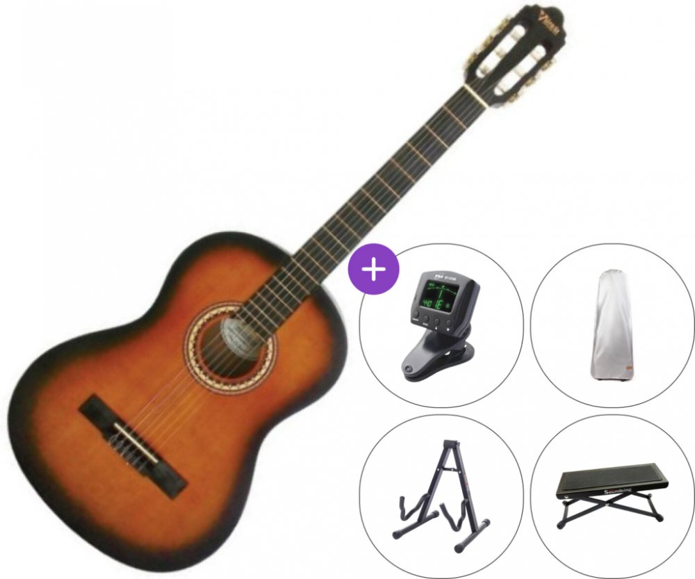 Klasická kytara v plné velikosti ze série 200, která je vyrobena podle přísných standardů společnosti Valencia v její vlastní továrně v Indonésii a nabízí vrchní desku ze dřeva smrku Sitka, tělo ze dřeva nato a krk z jabonu pro vyvážený tón. Výrazná, průhledná saténová povrchová úprava krásně ukazuje strukturu použitých dřevin, zatímco ebonizovaný mahagonový hmatník a kobylka s plastovým struníkem dotvářejí elegantní vzhled. Krk i vrchní deska jsou k tělu připojeny černou ABS vazbou. Krk nabízí 19 mosazných pražců a boční bodovou interziu. Délka menzury je 650 mm, šířka nultého pražce je 52 mm. Kytara kromě toho nabízí rozetu s motivem Valencia "Bat" a poniklovanou ladící mechaniku s krémovými knoflíky. Barevné provedení Classic Sunburst.