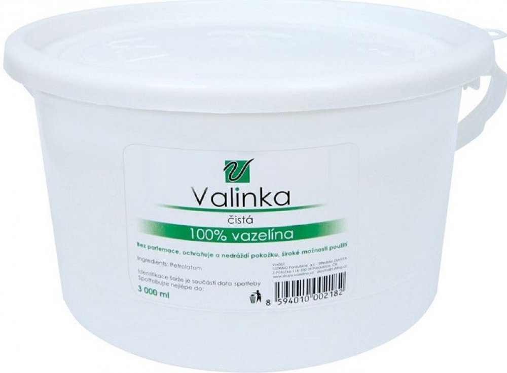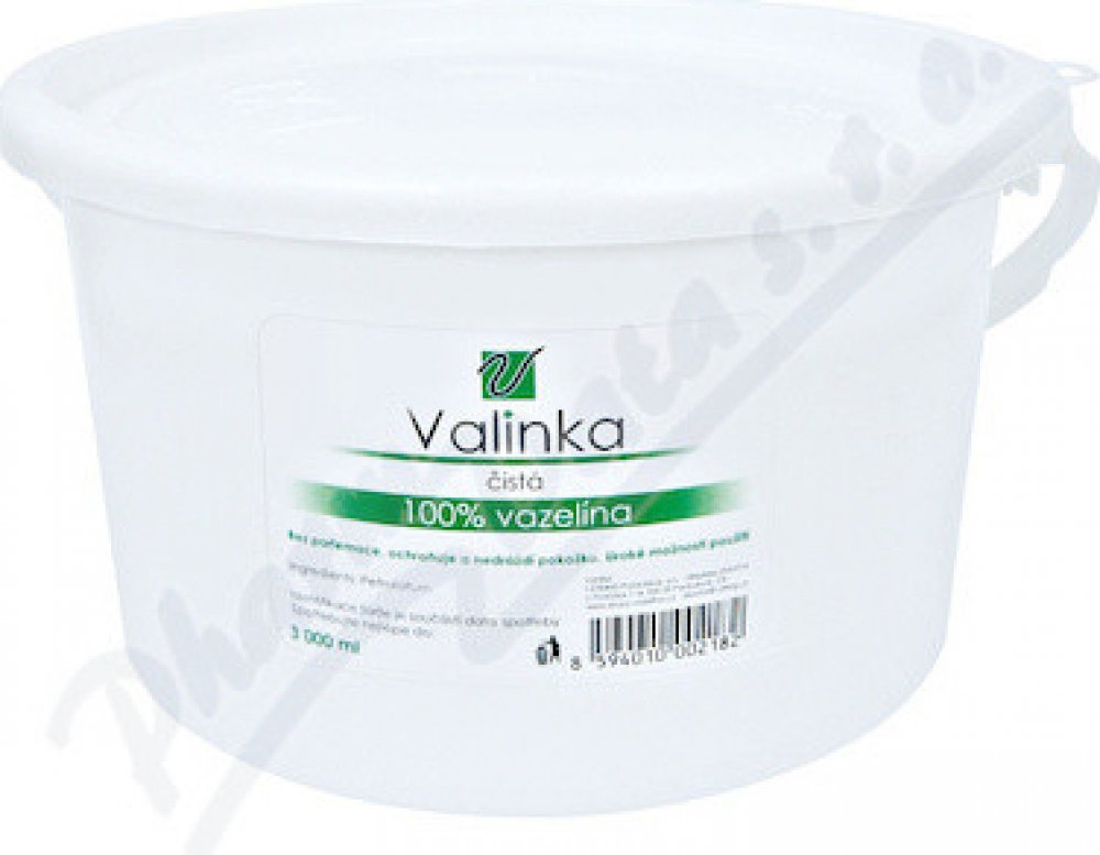 Vazelína čistá Valinka je univerzální kosmetický výrobek, 100 % bílá vazelína (Vaselinum album). Valinka má široké možnosti využití, je výborná k promašťování suché pokožky a ošetření jizviček, na ochranu pleti před vlhkem a chladem. Doporučuje se také na hrubou a popraskanou kůži, zejména pat, kolen a loktů.