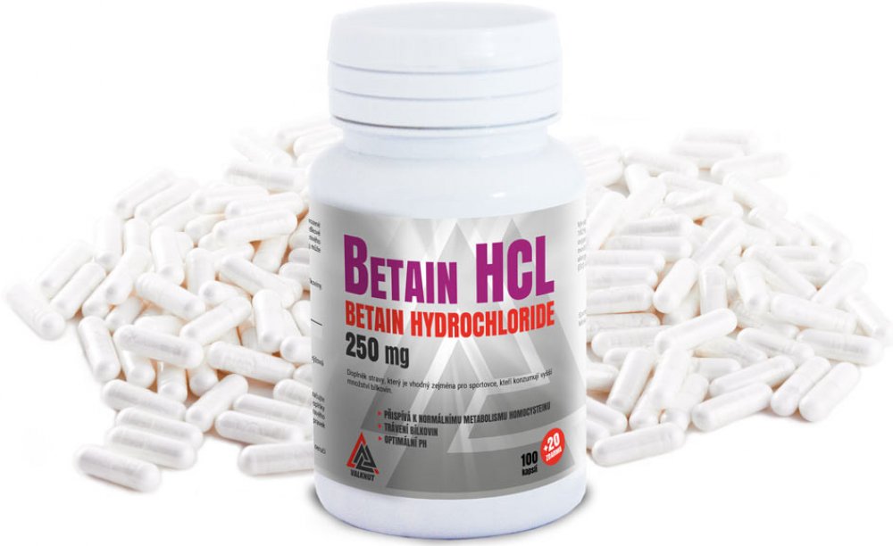 Doplněk stravy, který je vhodný zejména pro sportovce, kteří konzumují vyšší množství bílkovin. Betain Hydrochlorice je sloučenina, která se skládá z betainu a hydrochloridu, přirozeně se nachází např. v červené řepě. Po jejím požití se zvýší obsah kyseliny chlorovodíkové v žaludku a tím se stimuluje správné trávení a vstřebávání živin z potravy. Příznivého účinku se dosáhne při přívodu 1,5 g betainu denně. Denní příjem převyšující 4 g může výrazně zvýšit hladinu cholesterolu v krvi.