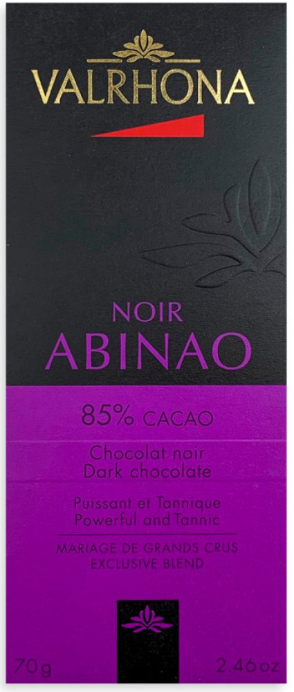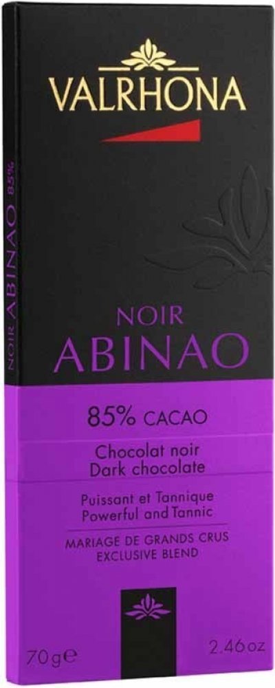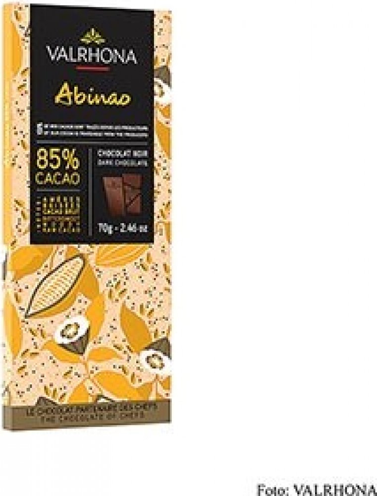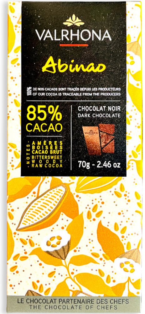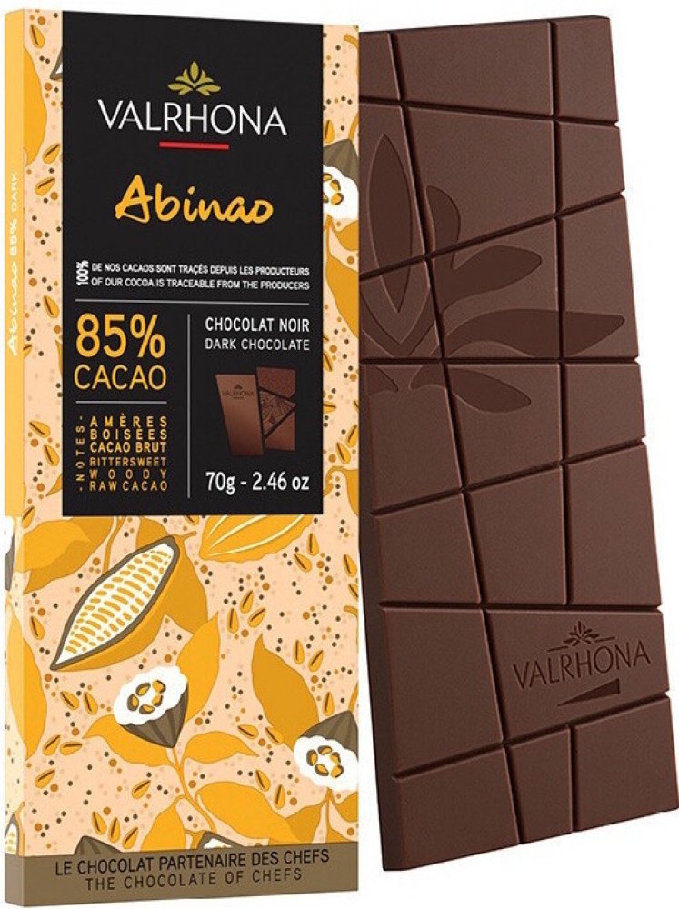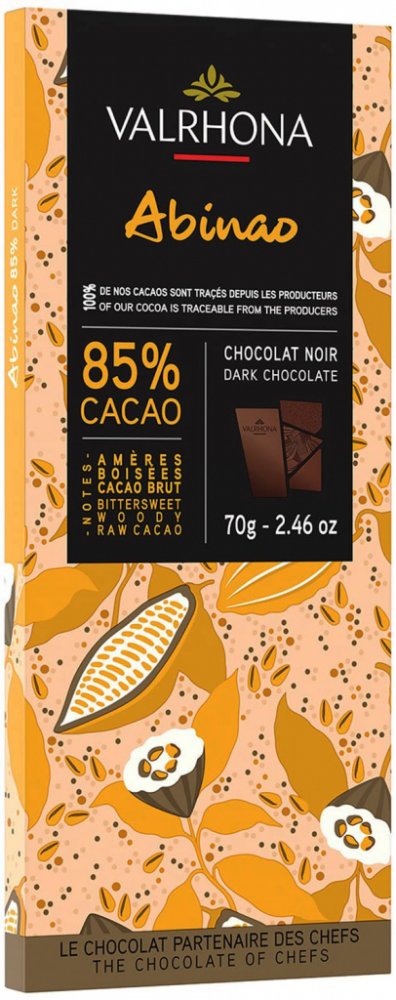 Akční cena, minimální trvanlivost do 04/2023. 85% hořká čokoláda od Valrhony ABINAO je vynikající tabulka s nízkým obsahem cukru, výraznými taniny a dlouhou příjemnou dochutí.