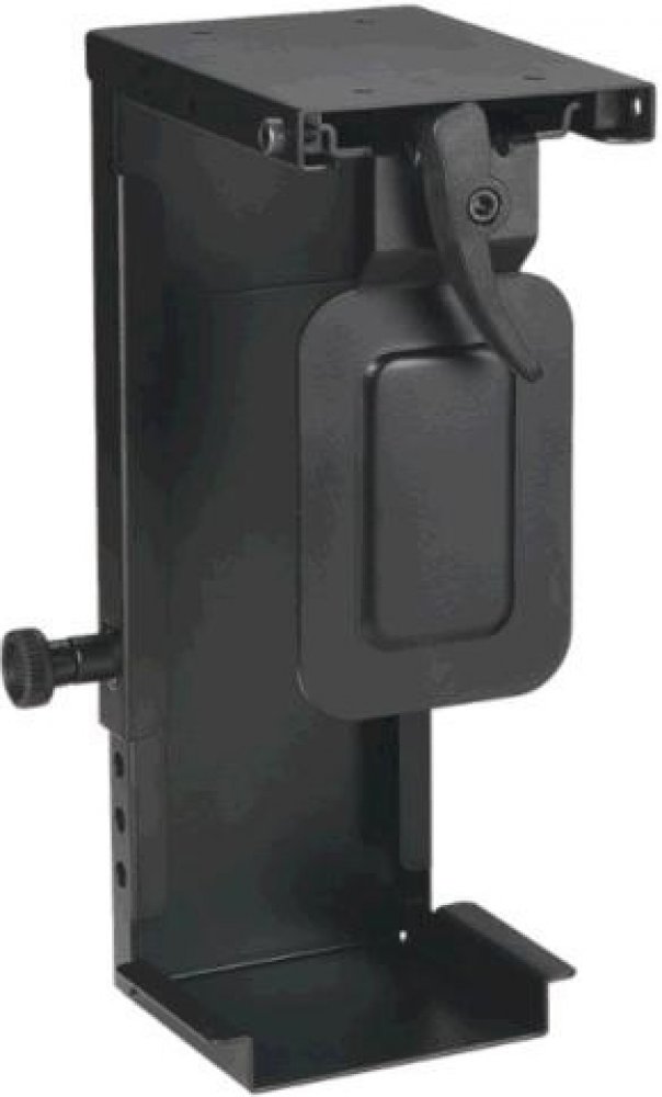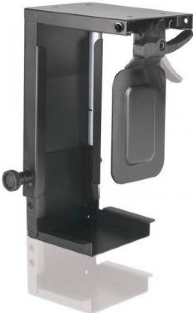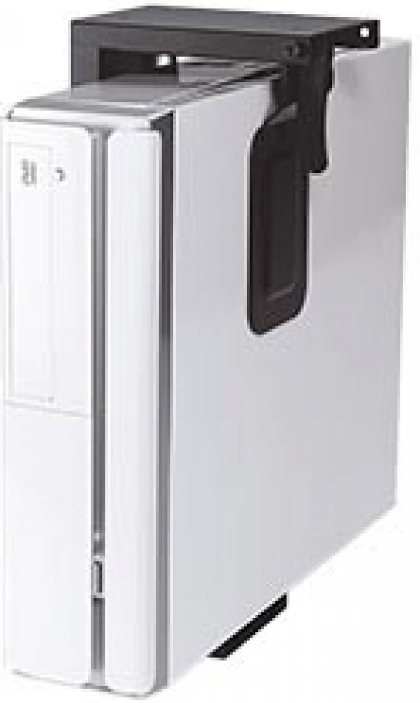 Držák na počítač montovaný pod desku stolu; Podpora: PC skříně šíře 50-100mm, výška 200-358mm; Nosnost: 10kg; Další informace: průměr otvorů pro přišroubování k desce stolu: 6mm; Barva: černá; Materiál: kov; Obsah balení: držák, 4 vruty pro připevnění k desce stolu, 3x pěnová samolepící podložka; Druh obalu: papírová krabice; Hmotnost výrobku: ...