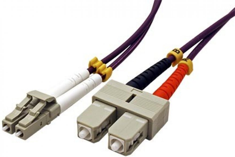 Duplexní optický kabel OM4 s konektory LC a SC.; Konektory: 2x LC(M) - 2x SC(M); Kabel: 2 spojené kabely s vícevidovým skleněným vláknem (průměr vlákna 50µm, průměr obalu vlákna 125µm) průměr kabelu: 1,8mm třída OM4; Šířka pásma: třída OM4; Další informace: - přiložen měřící protokol; Délka: 3m; Barva: fialová; Druh obalu: PE sáček; Hmotnost výrobku: 50g