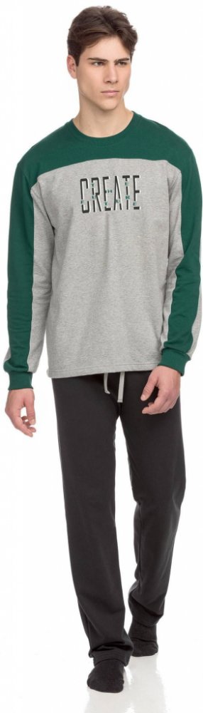 Značka Vamp! je oblíbená u zákazníků na celém světě. Kvalitní zpracování i materiály.Bavlněné domácí oblečení z kvalitního úpletu se výborně hodí na zimní i podzimní chladné večery. Krásně zahřeje a vy budete jako v bavlnce. Mikina i tepláky mají uvnitř příjemný a hřejivý chloupek.BarvaTmavě modré tepláky.Světle šedá mikina s tmavě zeleným pruhem přes ramena a rukávy.