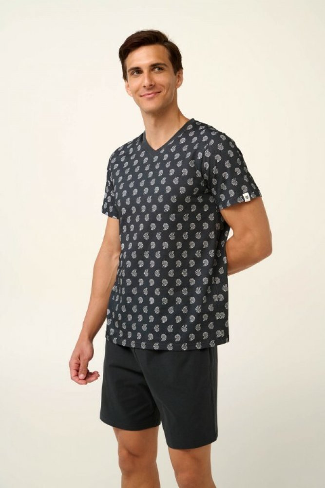 Velmi pěkné a elegantní pánské pyžamo Vamp s výstřihem do V a s krátkými rukávy. Pyžamo je vyrobeno z prvotřídního bavlněného úpletu, díky tomu je velmi měkké a příjemné na omak, poskytuje tak vysoký komfort při nošení. Vrchní díl je jemně vzorovaný s potiskem fosilie, pohodlně střižené kalhoty jsou jednobarevné. Pyžamo se vyrábí ve velikostech L, XL, 2XL, 3XL, 4XL (52 až 60) materiálové složení: 100% Bavlna.