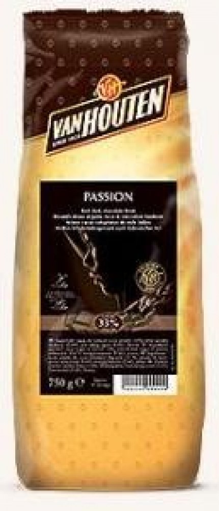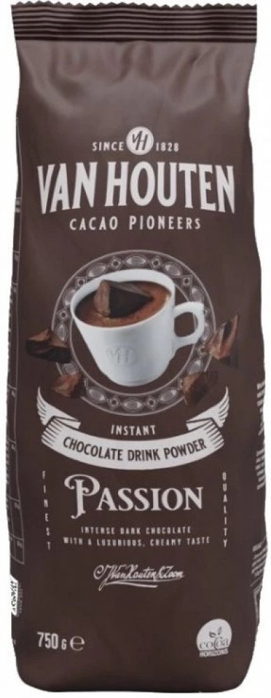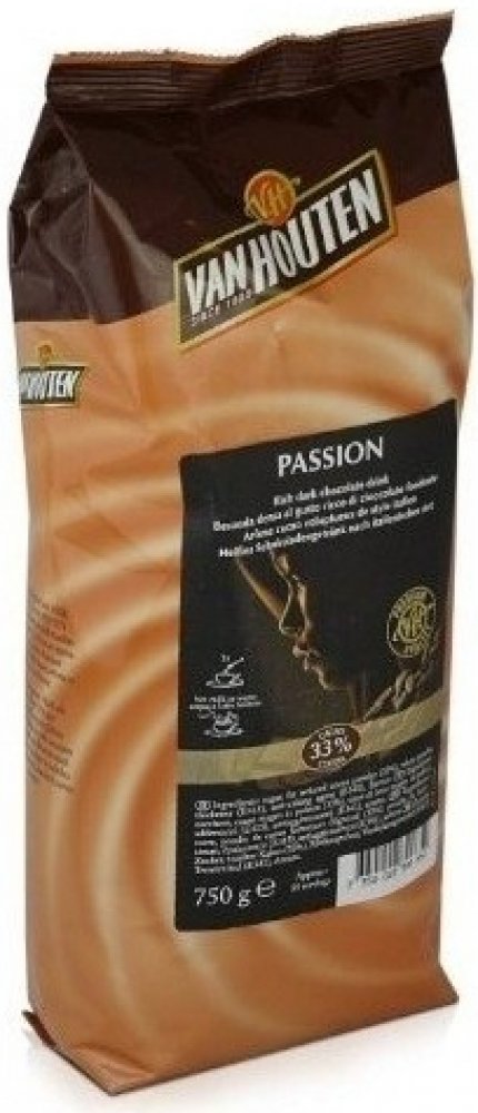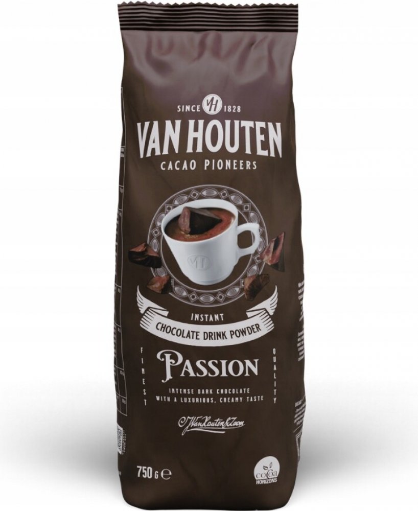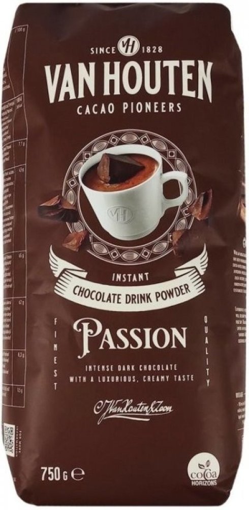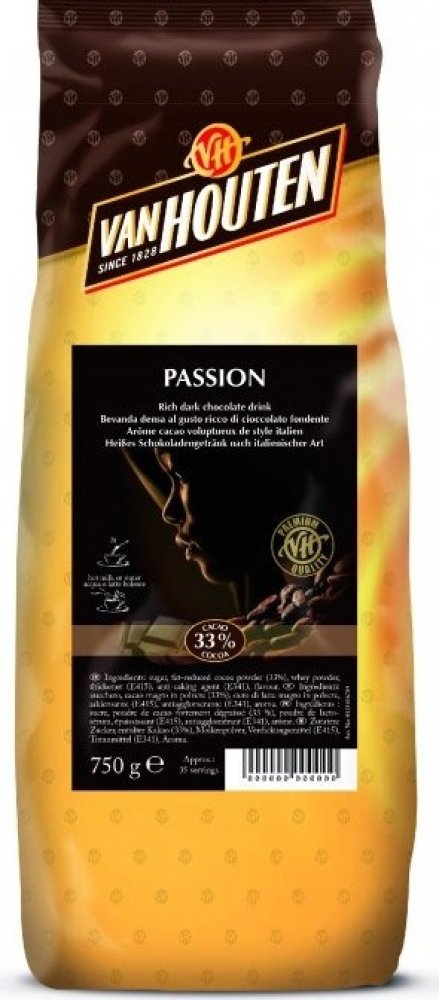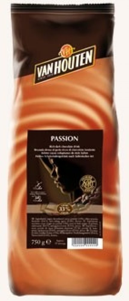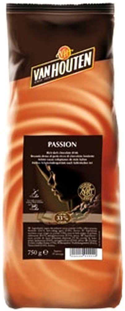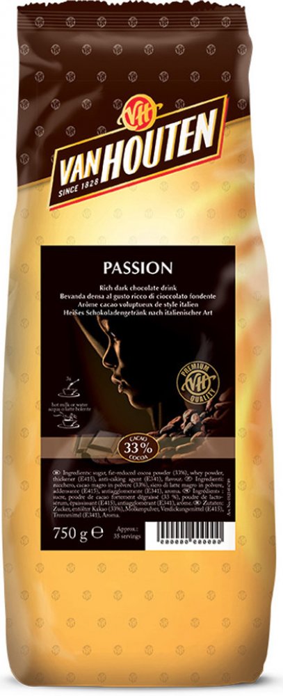 Nápoj připravený ze směsi Van Houten Passion Vám připomene svou silnou chutí a tmavou barvou nápoje italských kaváren. Možnost přípravy nápoje je rozmícháním do vody nebo do mléka. Z balení připravíte až 35 porcí. Vhodné pro profesionální přípravu ve vendingových přístrojích i pro ruční přípravu. Doporučené dávkování: 150 ml: 26 - 30 g, 180 ml: 32 - 36 g, 200 ml: 36 - 40 g, balení: 0,75 kg, Obsah kakaa: 33 %, Výrobce: Van Houten, Složení: cukr, kakaový prášek se sníženým obsahem tuku (33%), sušená syrovátka (mléko), zahušťovadlo E415, protispékavá přísada E341, aroma.