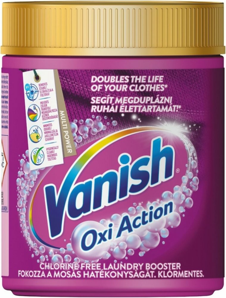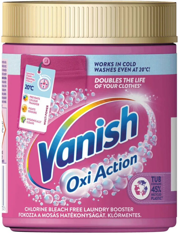 Univerzální práškový odstraňovač skvrn VANISH Oxi Action pro bílé a barevné prádlo dokáže odstranit skvrny již při prvním praní, funguje i při teplotě vody 30 °C. Díky svému jedinečnému složení vytváří molekuly aktivního kyslíku, díky kterým pronikne do hloubky vláken a zároveň je k textiliím maximálně šetrný. Neobsahuje bělící látky na bázi chloru, a přesto odstraní různé druhy čerstvých i zaschl...