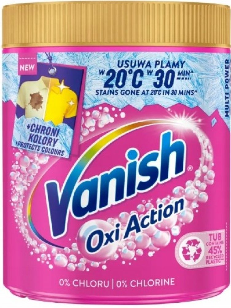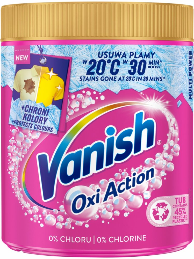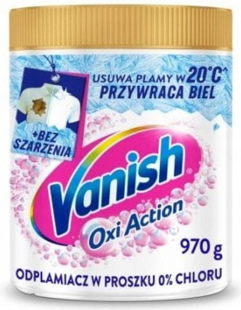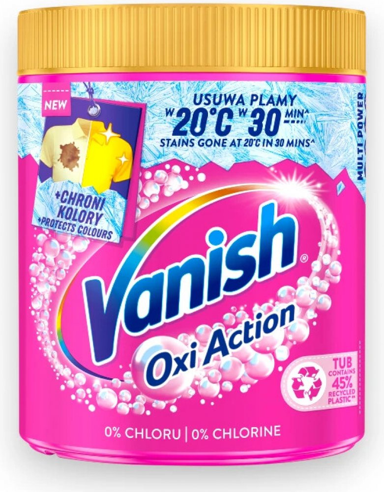 Vanish Oxi Action prací prášek – účinné odstranění skvrn už od 20 °C Vanish Oxi Action je špičkový prášek na praní, který odstraňuje i ty nejodolnější skvrny – a to už při nízkých teplotách od 20 °C. Bezpečný pro tkaniny, šetrný k barvám i vláknům. Pomáhá udržet vaše oblečení čisté a svěží po každém praní. ✨ Proč si Vanish zamilujete? Odstraní i odolné skvrny – víno, tráva, krev, káva Účinkuje už při 20 °C a za 30 minut Bez chlóru – šetrný k textilu Chrání barvy nebo obnovuje bělost (dle varianty) Ideální doplněk k pracímu prostředku ? Dostupné varianty (970 g): Oxi Action (růžový) – pro barevné prádlo, chrání barvy Oxi Action Crystal White (bílý) – pro bílé prádlo, obnovuje zářivou bělost ? Balení obsahuje 970 g prášku. Obal obsahuje 45 % recyklovaného plastu.