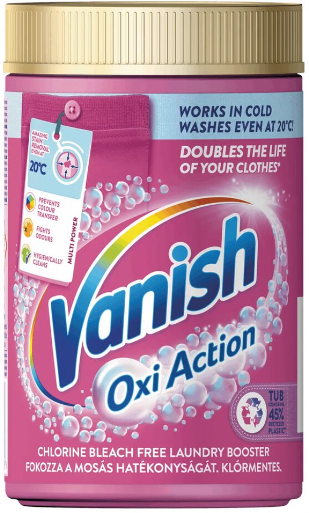 S Vanish Oxi Action práškem na odstranění skvrn se zbavíte i odolných skvrn už při 20 °C. Vanish Oxi Action prášek na odstranění skvrn vás efektivně zbaví odolných skvrn i pachů a zároveň pomůže zachovat vaše oblečení zářivě barevné. BENEFITY Účinné řešení i na nejnáročnější skvrny. Odstraňuje skvrny už při 20 °C. Chrání před nechtěným obarvením. Minimalizuje zápach. Zajišťuje hygienickou čistotu. Bezpečný pro bílé i barevné prádlo. Bez chlóru. NA CO VANISH POUŽÍT Vanish Oxi Action prášek na odstranění skvrn je bezpečný pro barevné i bílé prádlo, pro každodenní tkaniny jako je bavlna a polyester.Ať už vás trápí skvrny od jídla a pití nebo třeba od bahna, Vanish Oxi Action prášek je odstraní už při 20 °C.