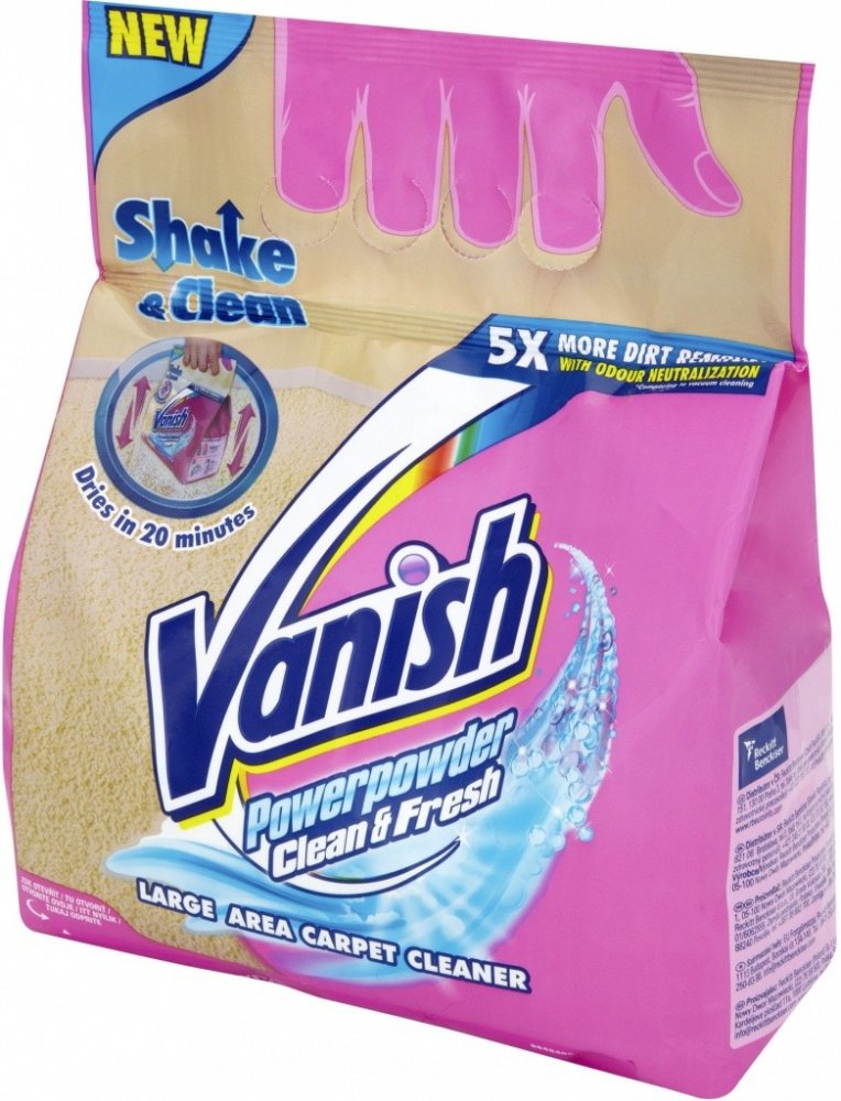 Čistič koberců na velké plochy Vanish PowerPowder je naším převratným novým produktem který vám koberec vyčistí a dodá mu svěžest Tento vlhký prášek pomáhá odstranit odolnou zažranou špínu zápach a prach zachycený hluboko uvnitř vlasu koberce Balení bylo nově navrženo aby bylo snazší prostředek používat v domácnosti na velké plochy Prášek během svého působení rychle zasychá takže máte koberec za pouhých 20 minut suchý a krásně voňavý