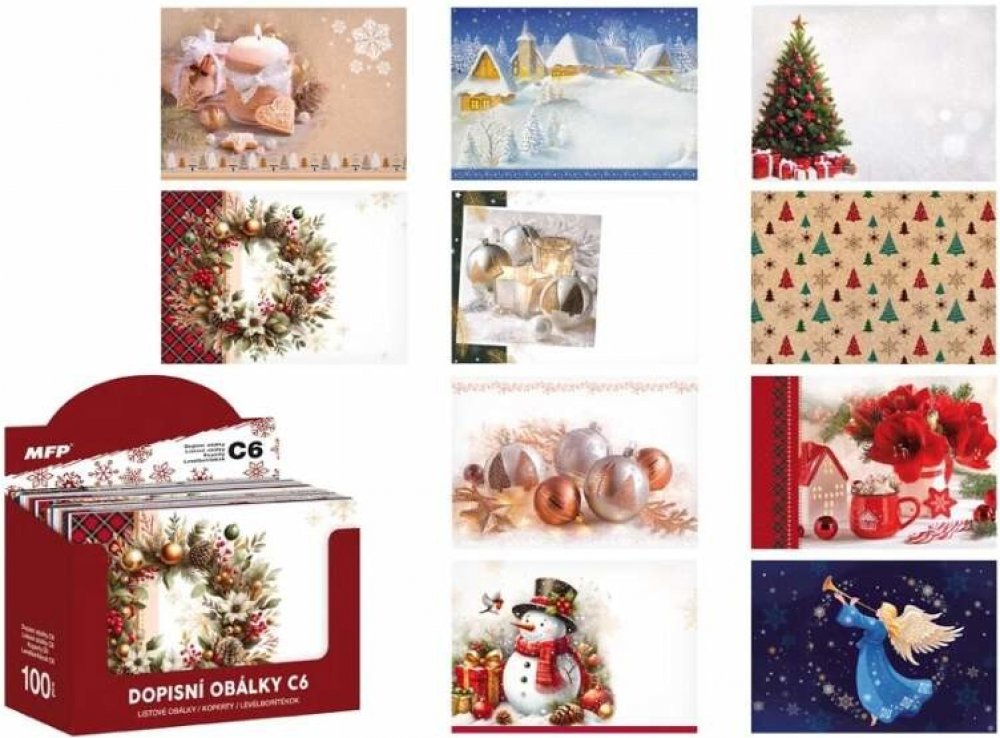Celoplošně potištěné vánoční dopisní obálky C6 s krycí páskou. Posíláte rádi vánoční dopisy? Jestli ano, tak si u nás pořiďte krásné dopisní obálky s vánočními motivy.BALENÍ OBSAHUJE:- 100 ks dopisních obálek s vánočním motivem (10 různých motivů)Všech 100 ks dodáváme v pěkné papírové krabičce, která může zároveň sloužit jako stojánek.Uvedená cena je za 1 ks.
