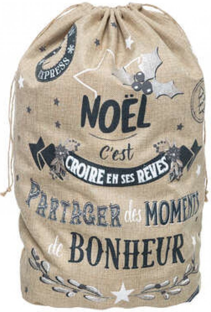 Velký jutový pytel bude krásnou dekorací, ale také praktický a originální způsob jak zabalit vánoční dárek. Můžete jej použít jak na Vánoce tak i na Mikuláše. Je ozdobený modrými nápisy a vánočními motivy. Zavazuje se pomocí přírodní šňůry, která je umístěná v tunýlku.