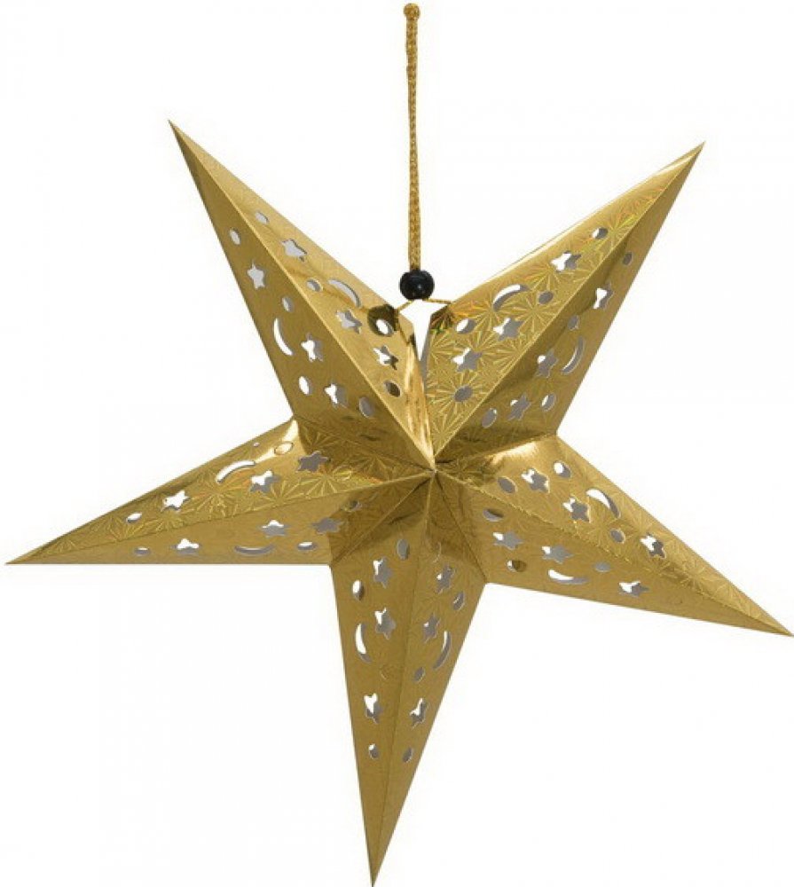 Dekorační skládací papírová hvězda. Průměr 75 cm, vhodná např. pro výrobu vánočního osvětlení (žárovky a příslušenství nejsou součástí dodávky). Možnost zavěšení. Hvězda je vyrobena z odolného kartonu a má vyražené motivy hvězd a měsíce.