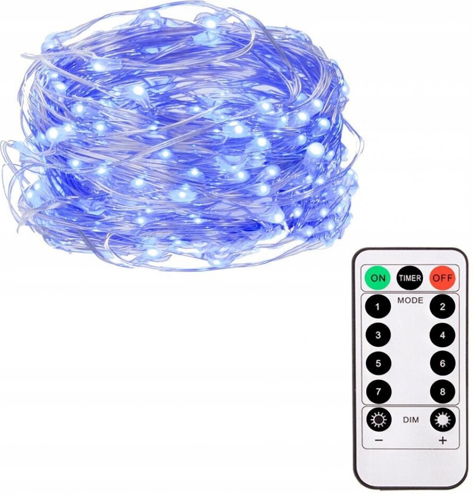 Ultratenký světelný řetěz s 8 světelnými funkcemi a dálkovým ovládáním. Napájení na baterie. Vnitřní i vnější použití, krytí IP44. Délka světelné části 9,9 m, napájecí kabel 30 cm. Barva světla modrá, 100 LED, napájení 3x AA baterie.