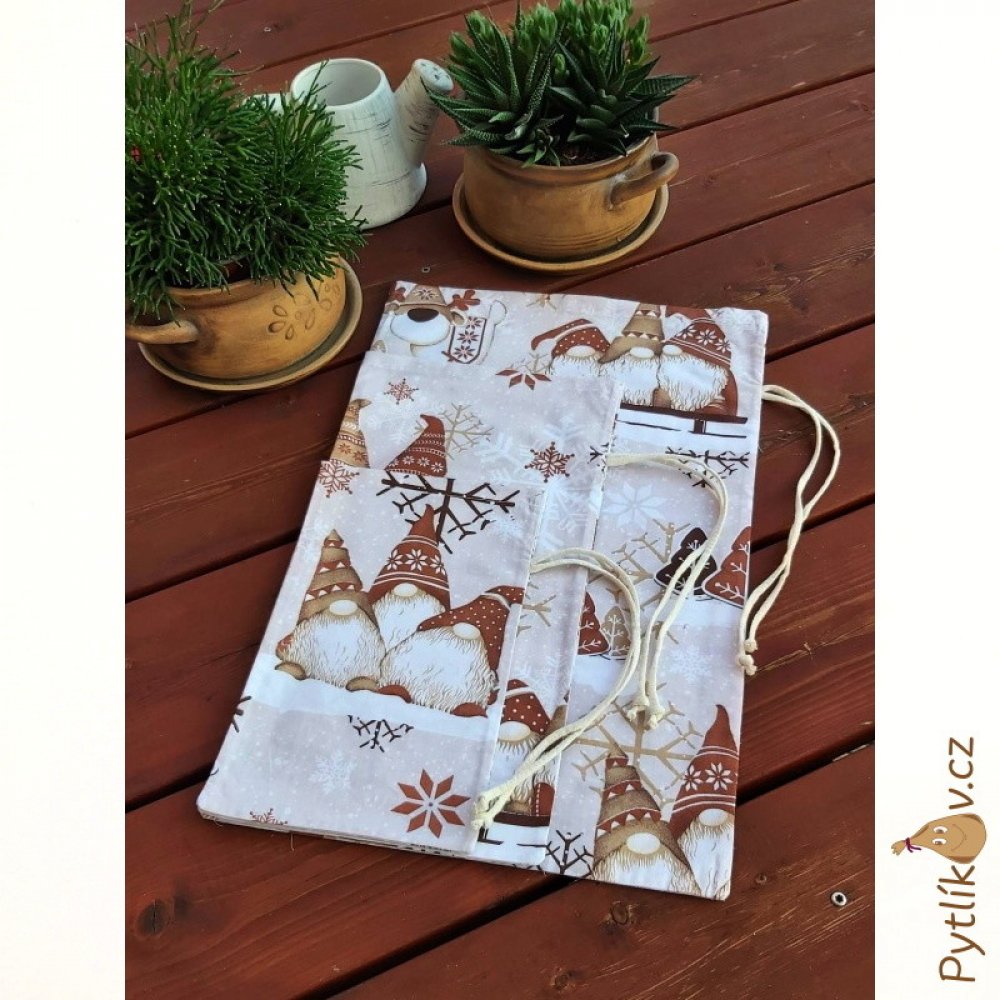 Plátěný pytlík s motivem Vánoční skřítci - hnědá, plátěné pytlíky na zavázání