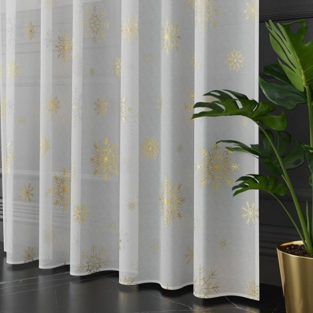 p Vánoční voálová záclona se zlatým potiskem sněhových vloček. Záclona je ideální v době adventu, kde dodá domovu pravou vánoční atmosféru. Voálové záclony jsou velice oblíbené pro svůj moderní vzhled a výšku. Vánoční voál je na spodním okraji zatížen zátěžovým olůvkem. Výška voálu je 290 cm. br / Složení: 100% polyester br / Zlaté vločky mají velikost od 6 do 10 cm. /p