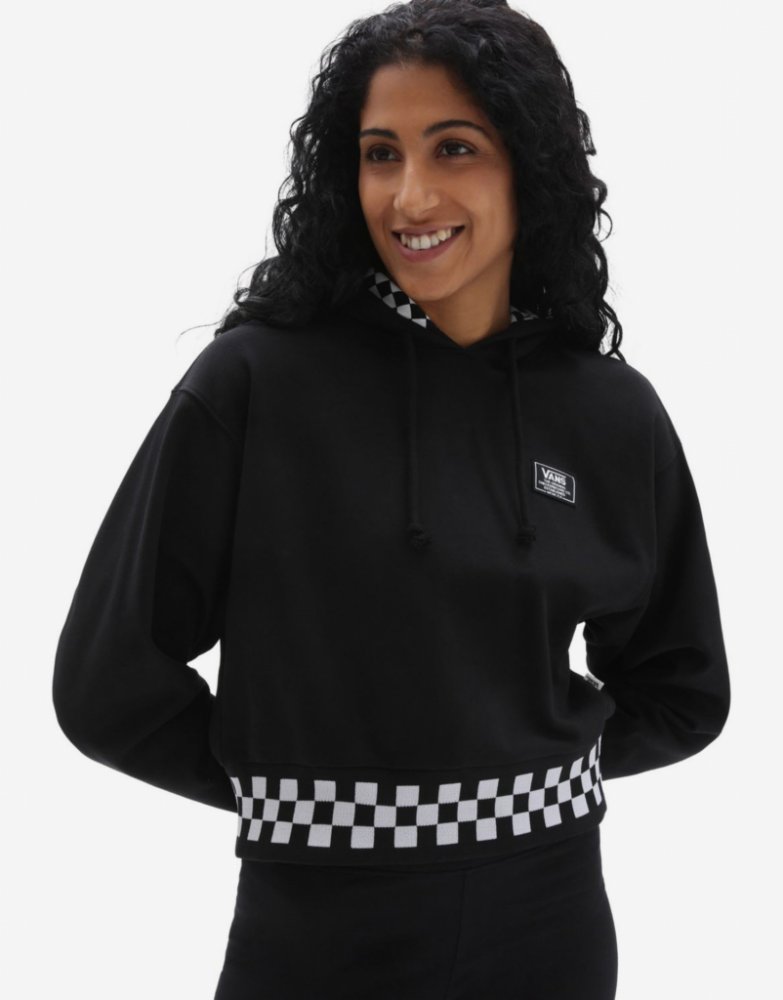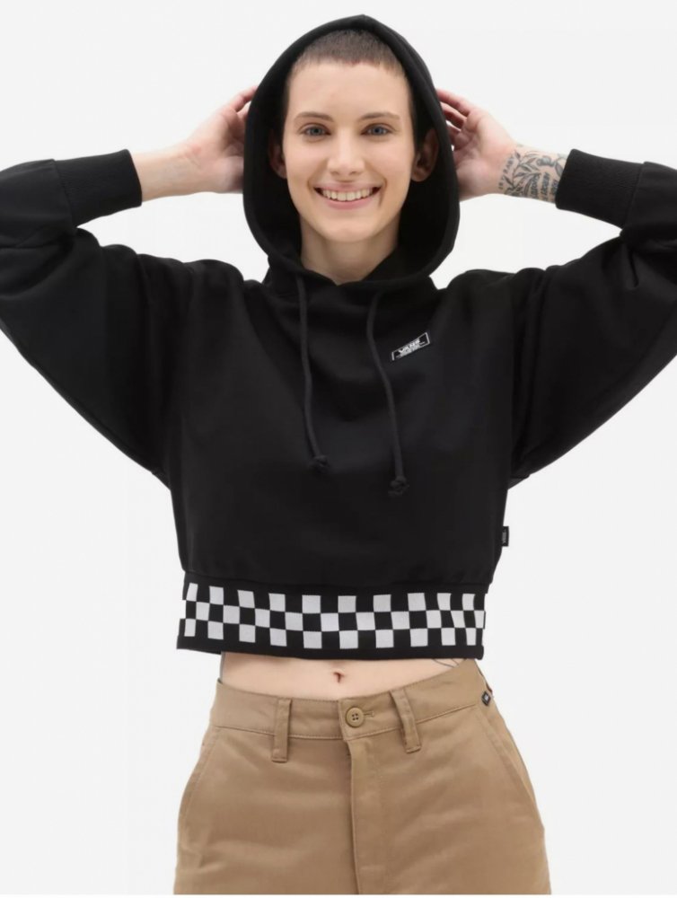 Dámská crop mikina Vans BOOM BOOM CHECK HOODIE Black Materiál: 80% bavlna, 20% polyester Specifikace: Příjemný vnitřní fleece materiál Pružné manžety a spodní lem Nášivka na přední straně Šachovnicový spodní lem Kapuce se stahovací šňůrkou