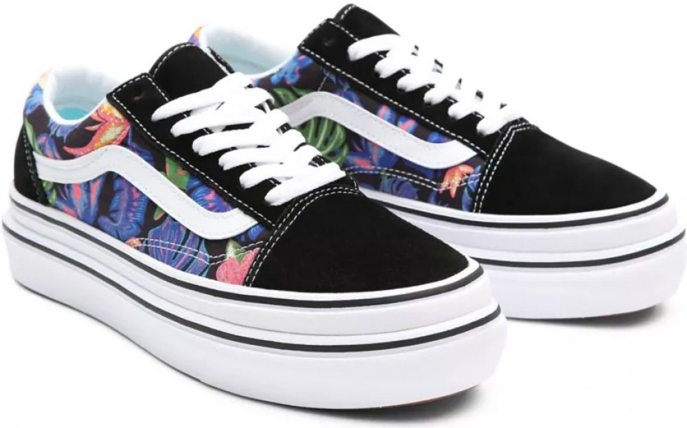 Odlehčené dámské boty Vans Super Comfycush Old Skool tropicali black/true white, materiál semiš, textil, syntetika. Odlehčená verze modelu Old Skool s dvojitou podešví ve stylu boty na platformě. Odlehčená podrážka s protiskluzovým Vans „wafle“ vzorem. Potisk je u každých bot jinak rozložen.